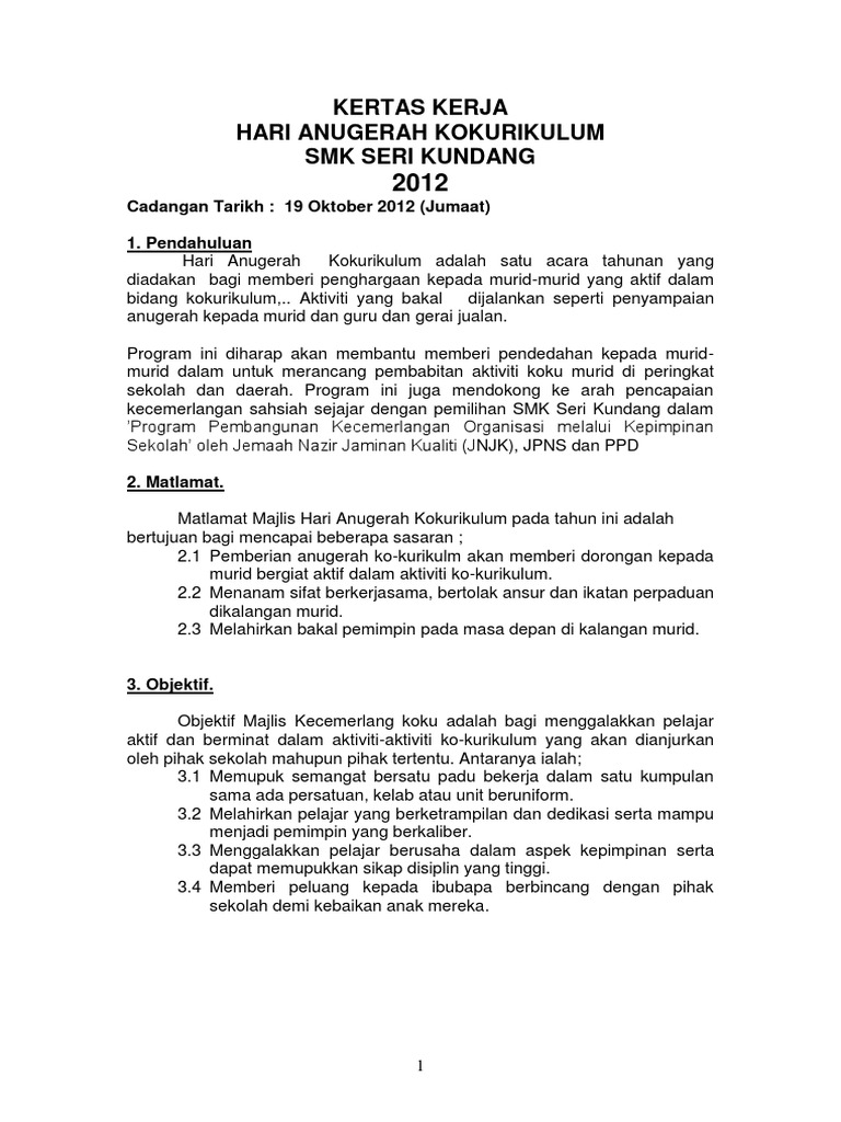 . Antara objektif Anugerah Kokurikulum ini ialah. CONTOH TEKS JURUACARA Nama Majlis Tempat Tarikh Hari Masa. KERTAS KERJA HARI ANUGERAH KOKURIKULUM DAN NILAM PERINGKAT SR ARAB JAIM PERNU 2014 10 PENDAHULUAN Anugerah kokurikulum adalah satu program yang dijalankan.